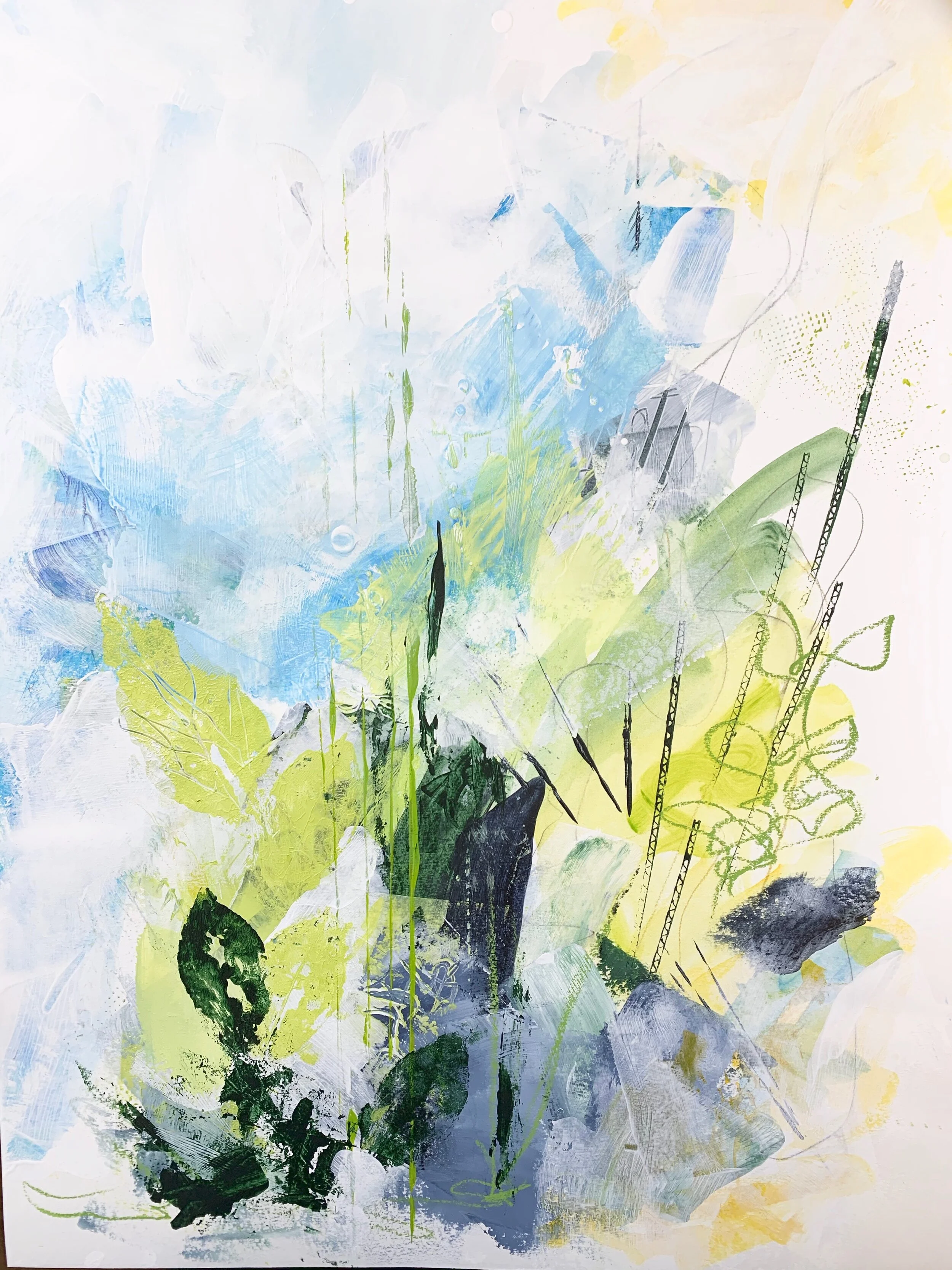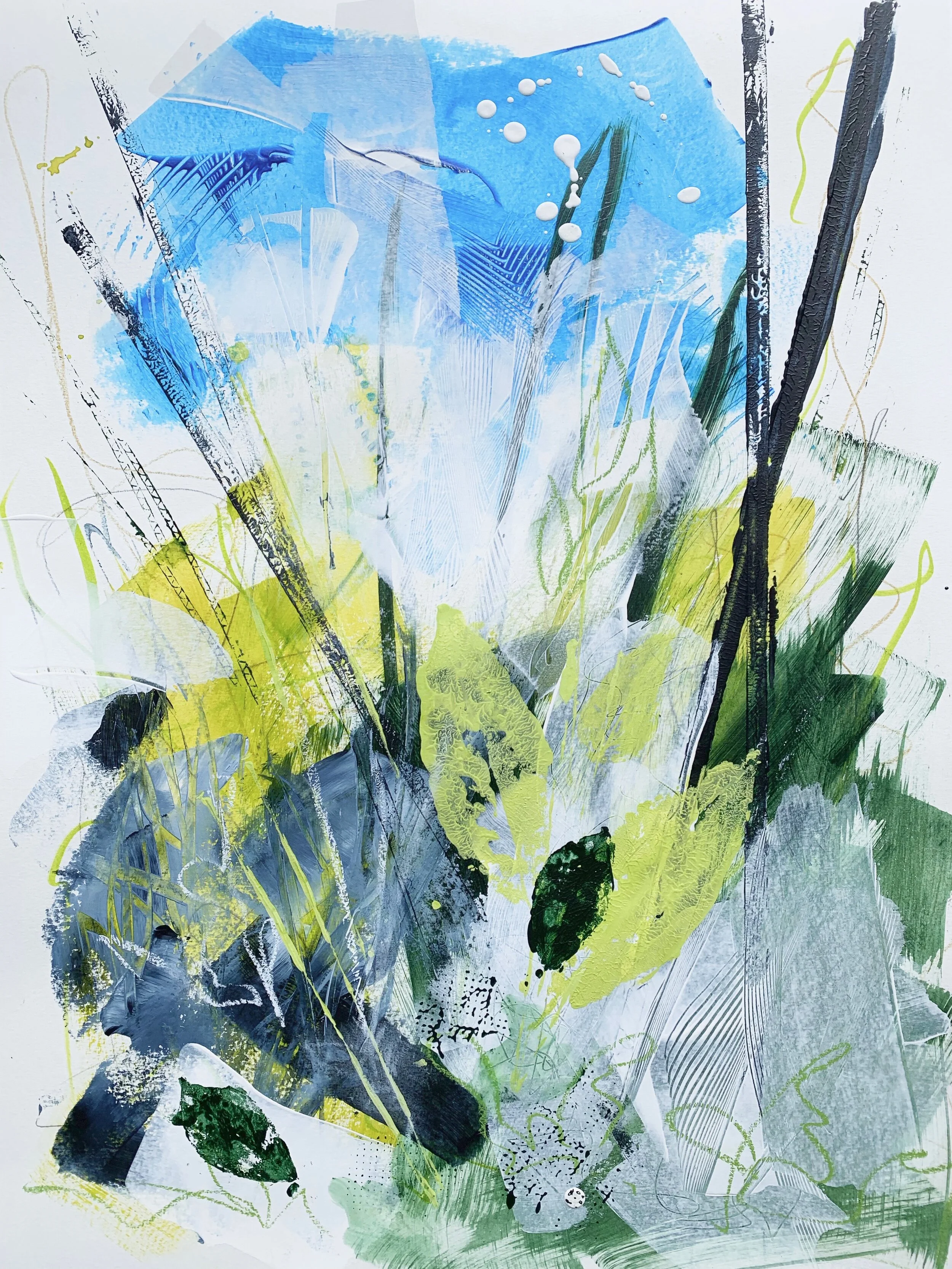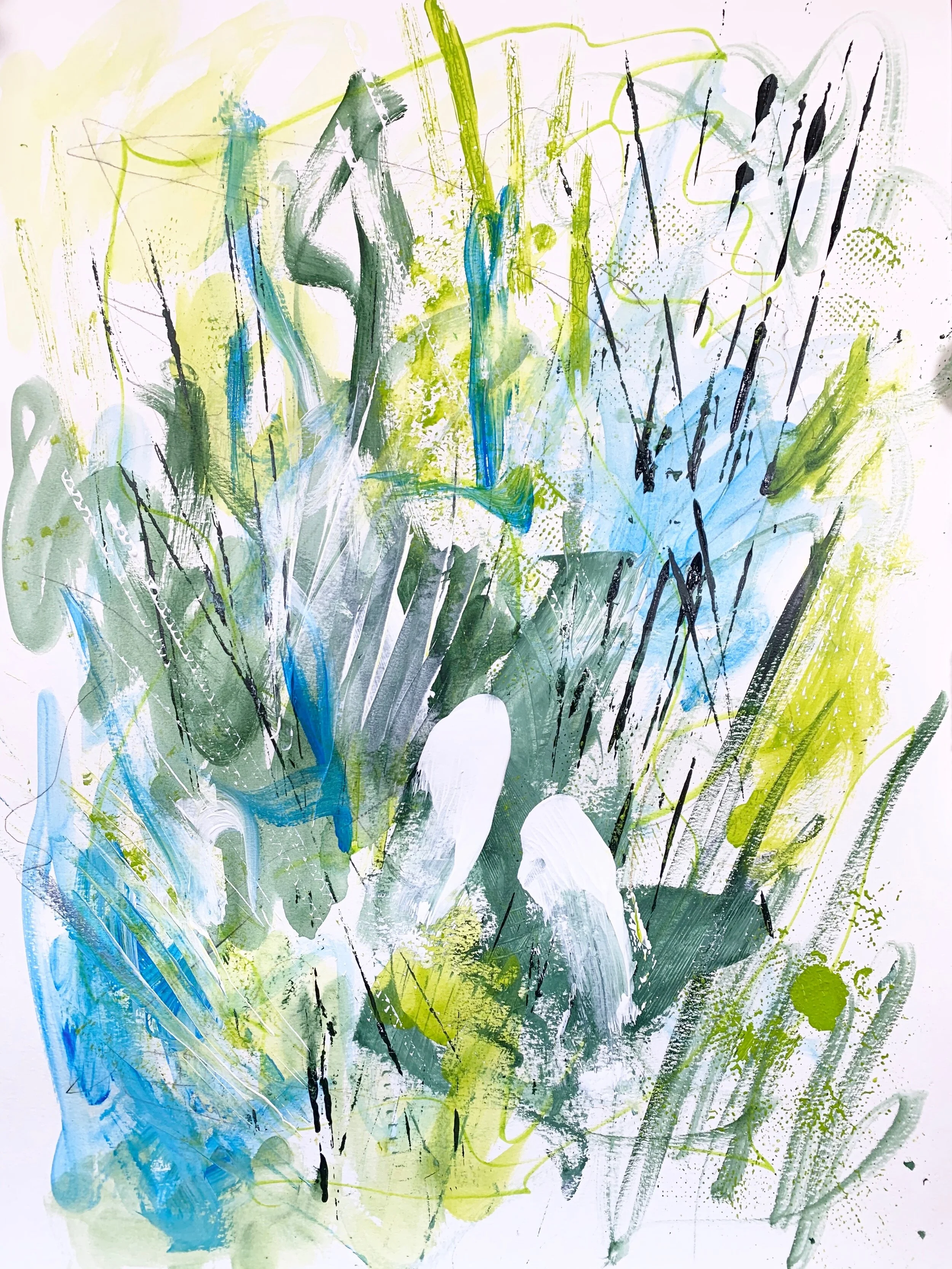 My new painting series is starting to unfold as I complete weekly assignments as part of an expressive arts course I’m taking. Through this series I want to transfer the feeling of deep renewal and relief that I felt while regaining inner peace while walking through the woods amidst the chaos of the pandemic.