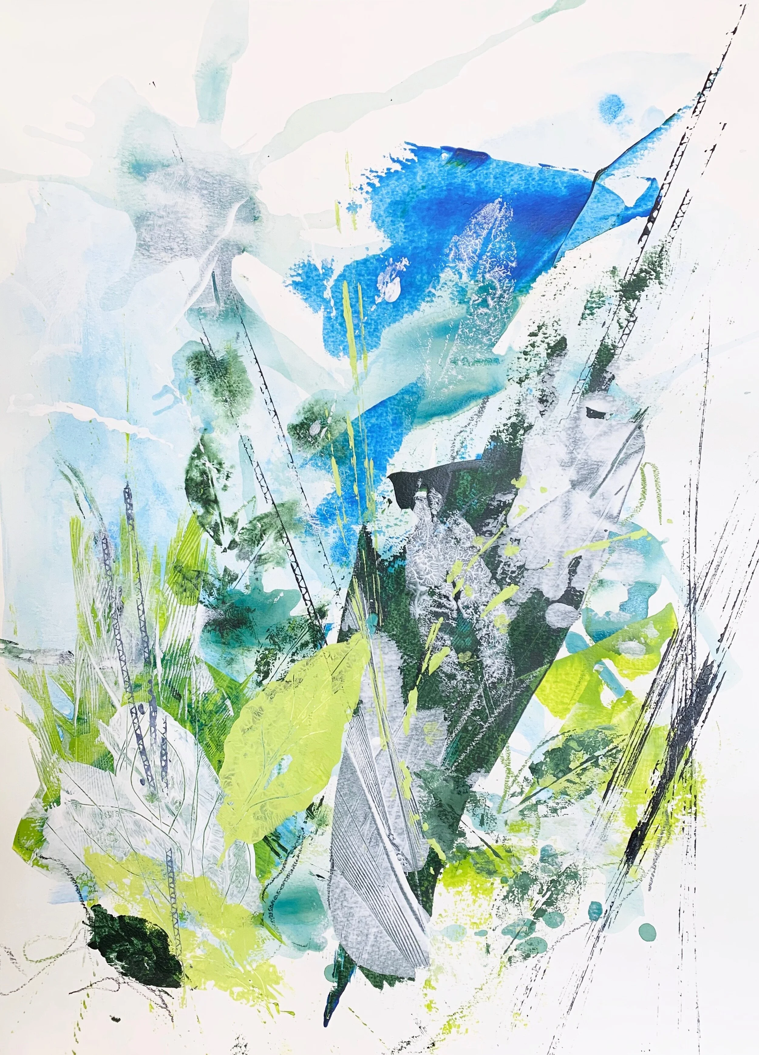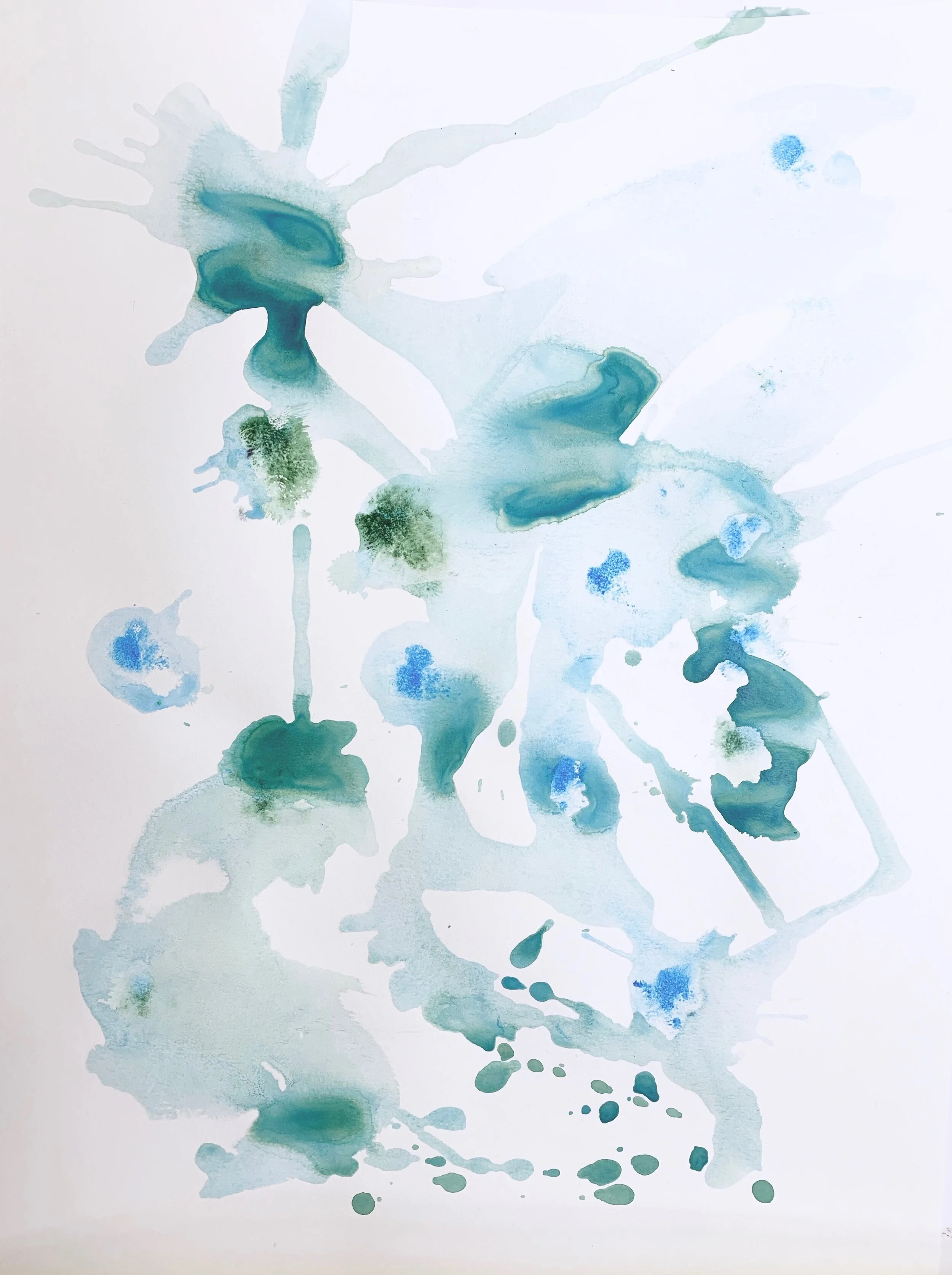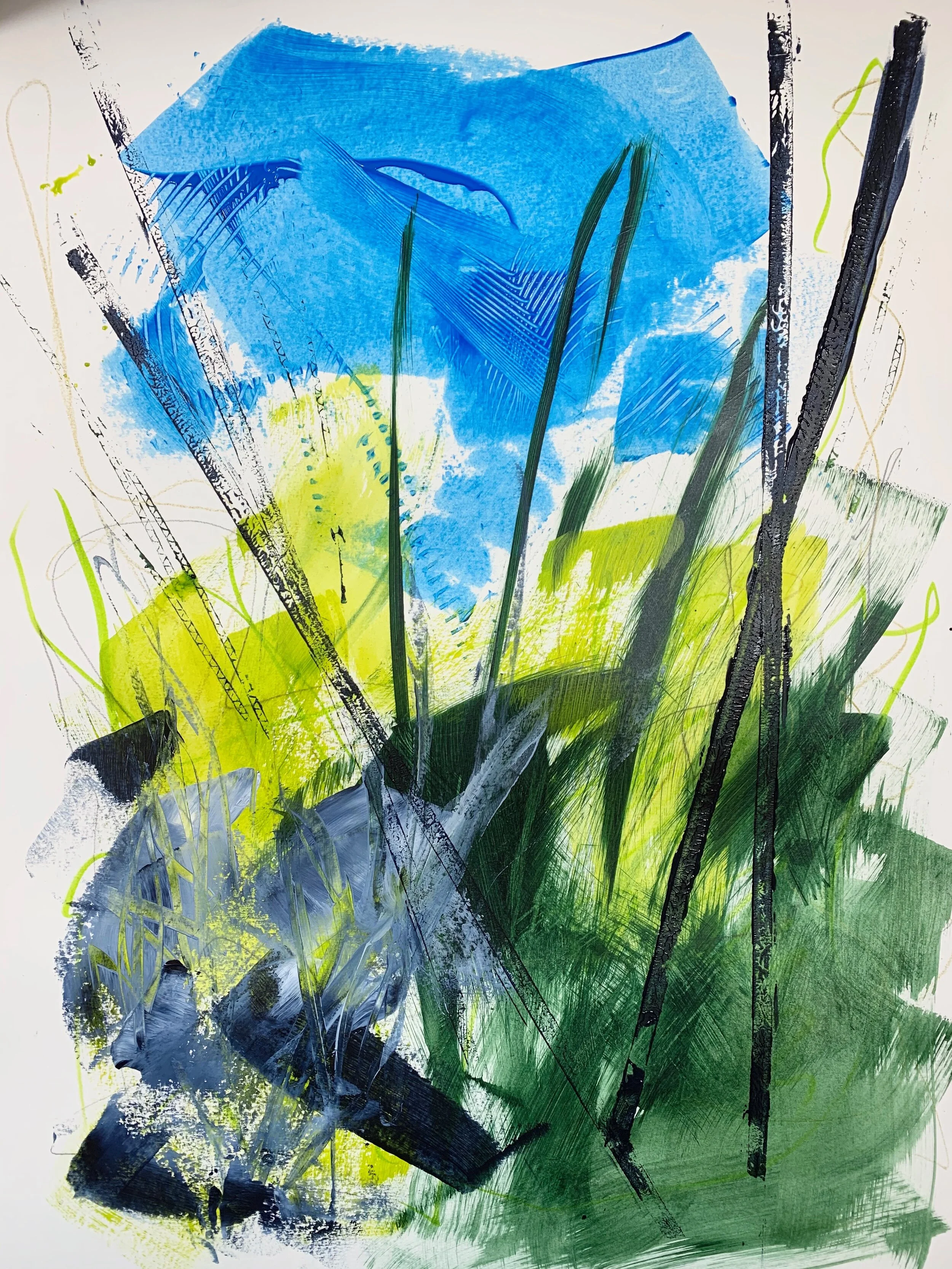 My new painting series is starting to unfold as I complete weekly assignments as part of an expressive arts course I’m taking. Through this series I want to transfer the feeling of deep renewal and relief that I felt while regaining inner peace while walking through the woods amidst the chaos of the pandemic.